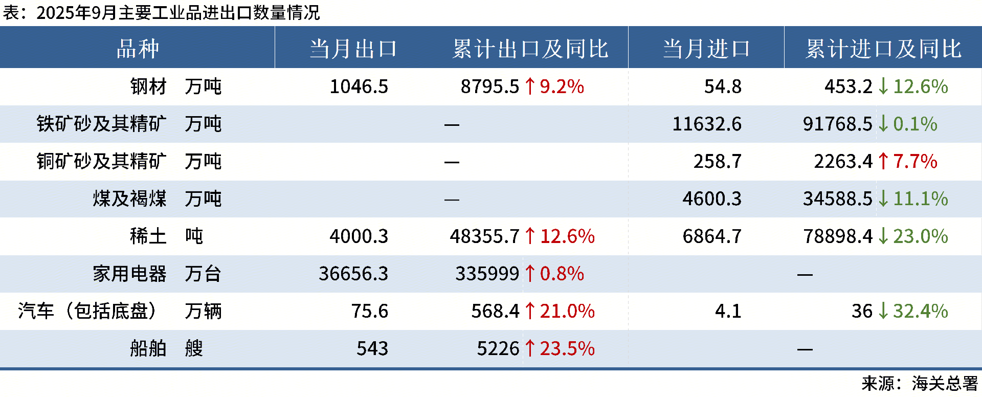 ◎ 海關(guān)總署:9月中國出口鋼材1046.5萬(wàn)噸;1-9月累計出口鋼材8795.5萬(wàn)噸,同比增長(cháng)9.2%。其他主要工業(yè)品進(jìn)出口情況如下: