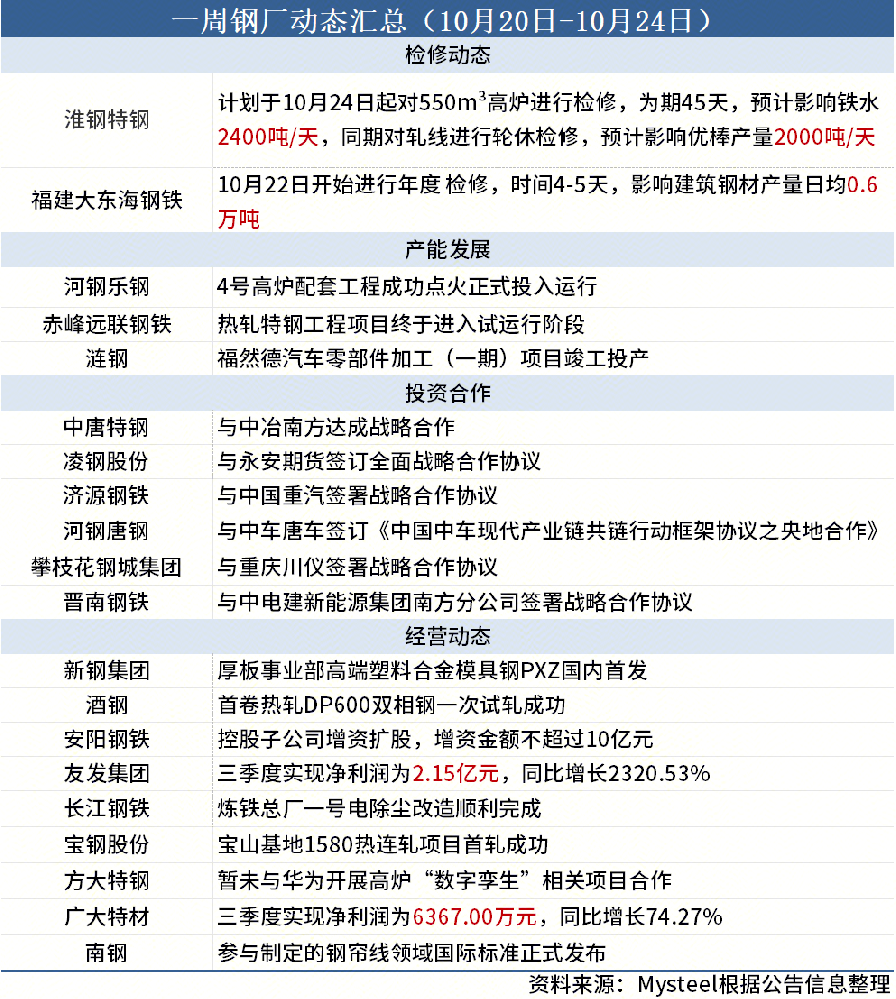 據Mysteel不完全統計,本周(10月20日-10月24日)2家鋼廠(chǎng)發(fā)布檢修信息,具體如下: