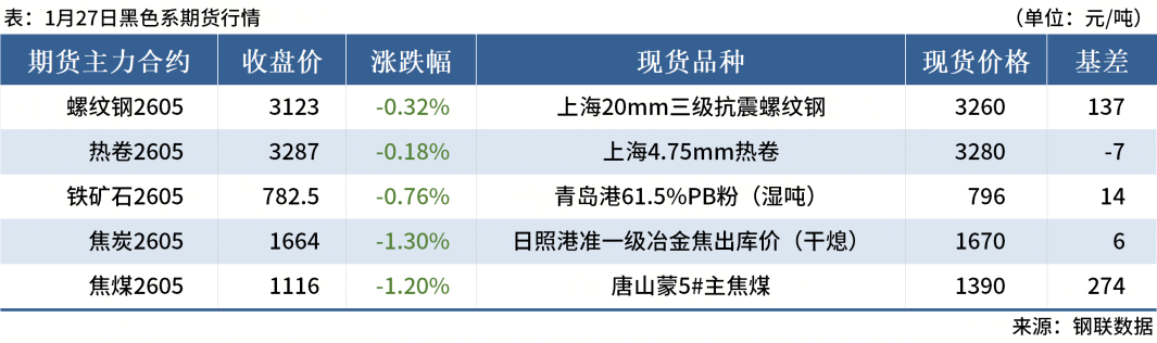 ◎1月27日,全國主港鐵礦石成交80.95萬噸,環(huán)比減23.2%;237家主流貿(mào)易商建筑鋼材成交6.63萬噸,環(huán)比減12.8%。