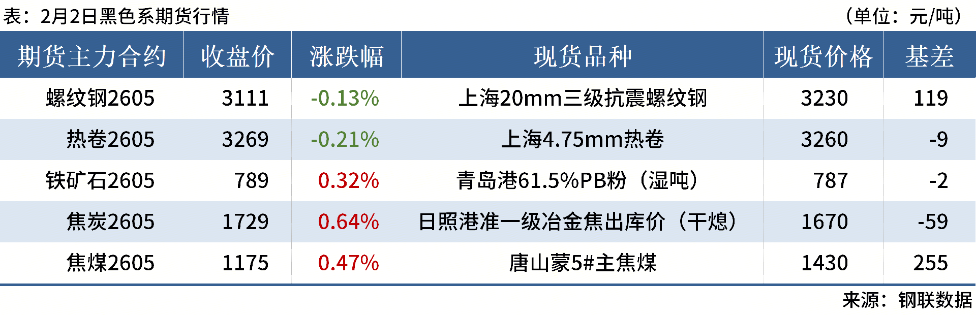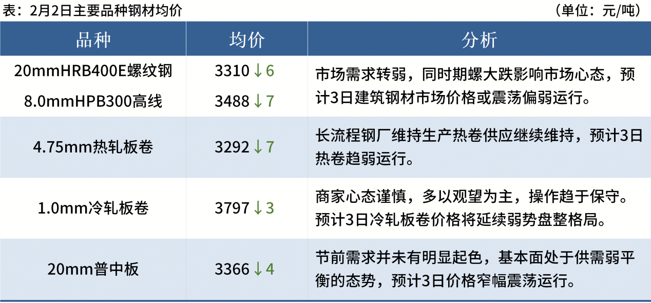 ◎ 2月2日,全國(guó)主港鐵礦石成交81.70萬(wàn)噸,環(huán)比減9.9%;237家主流貿(mào)易商建筑鋼材成交4.68萬(wàn)噸,環(huán)比減16.5%。