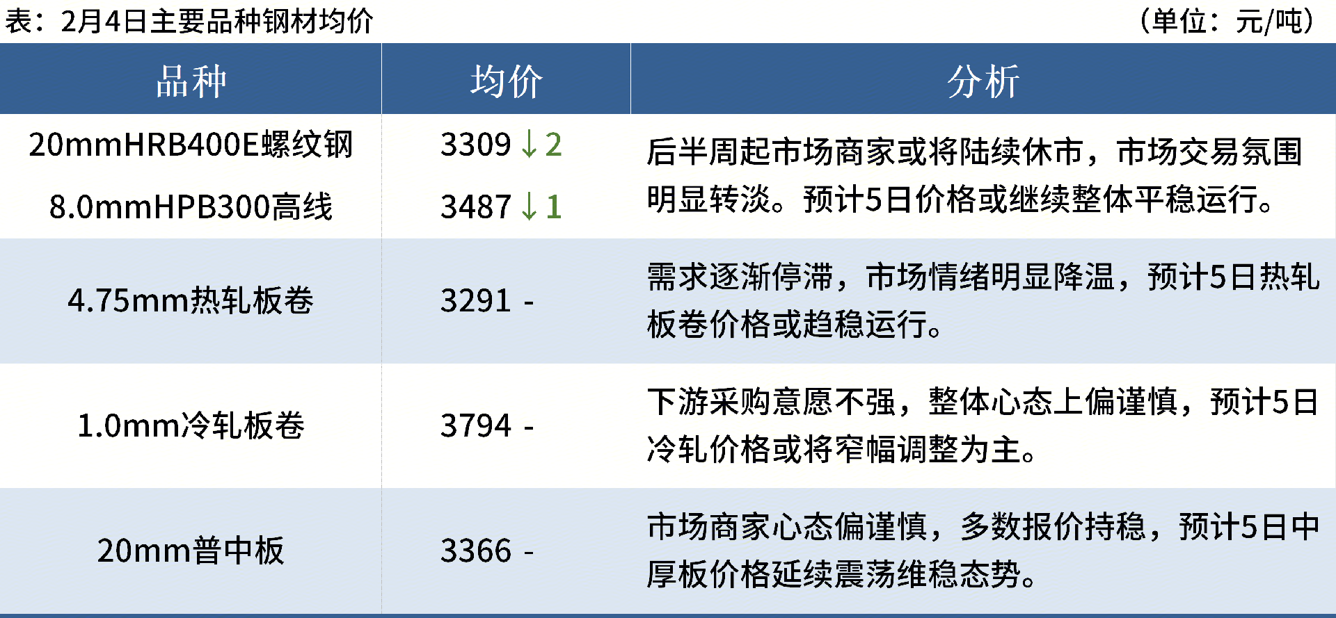 ◎ 2月4日,全國(guó)主港鐵礦石成交103.40萬(wàn)噸,環(huán)比增14%;237家主流貿(mào)易商建筑鋼材成交3.61萬(wàn)噸,環(huán)比減12.6%。