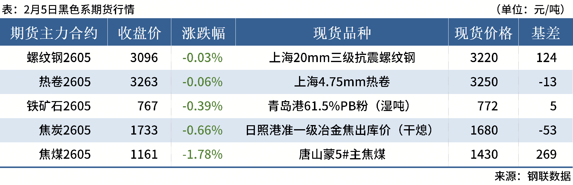 ◎ 2月5日,全國主港鐵礦石成交98.60萬噸,環(huán)比減4.6%;237家主流貿(mào)易商建筑鋼材成交2.79萬噸,環(huán)比減22.7%。