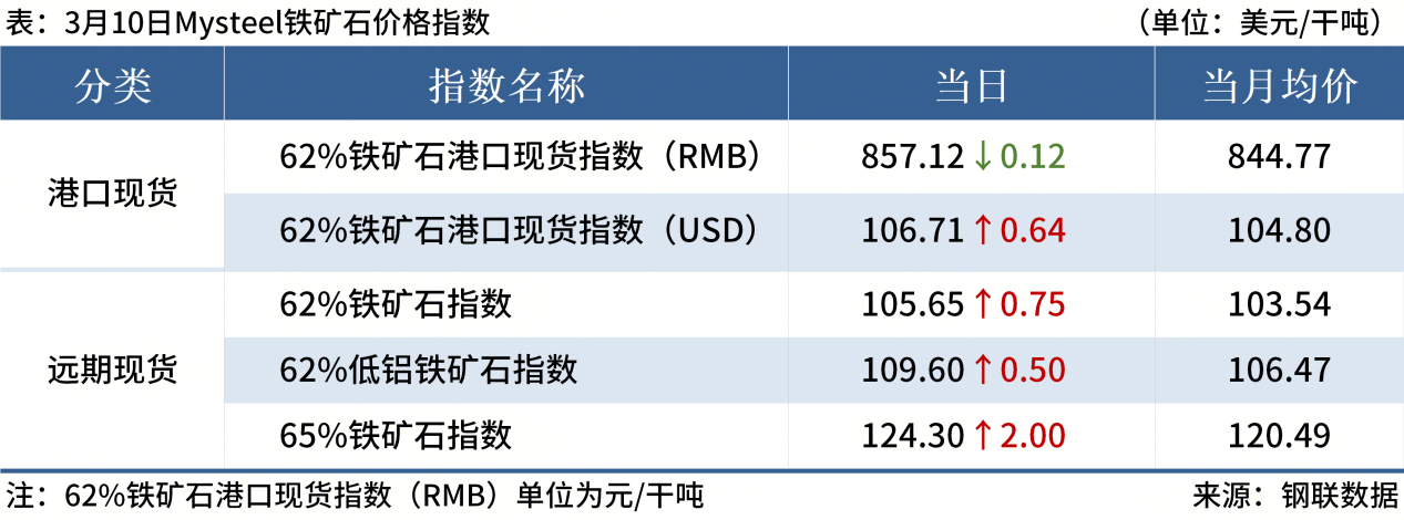 ◎ 3月10日,Mysteel進(jìn)口鐵礦石 62%澳洲粉礦遠(yuǎn)期現(xiàn)貨指數(shù)105.65美元/干噸,漲0.75美元/干噸,月均103.54美元/干噸。