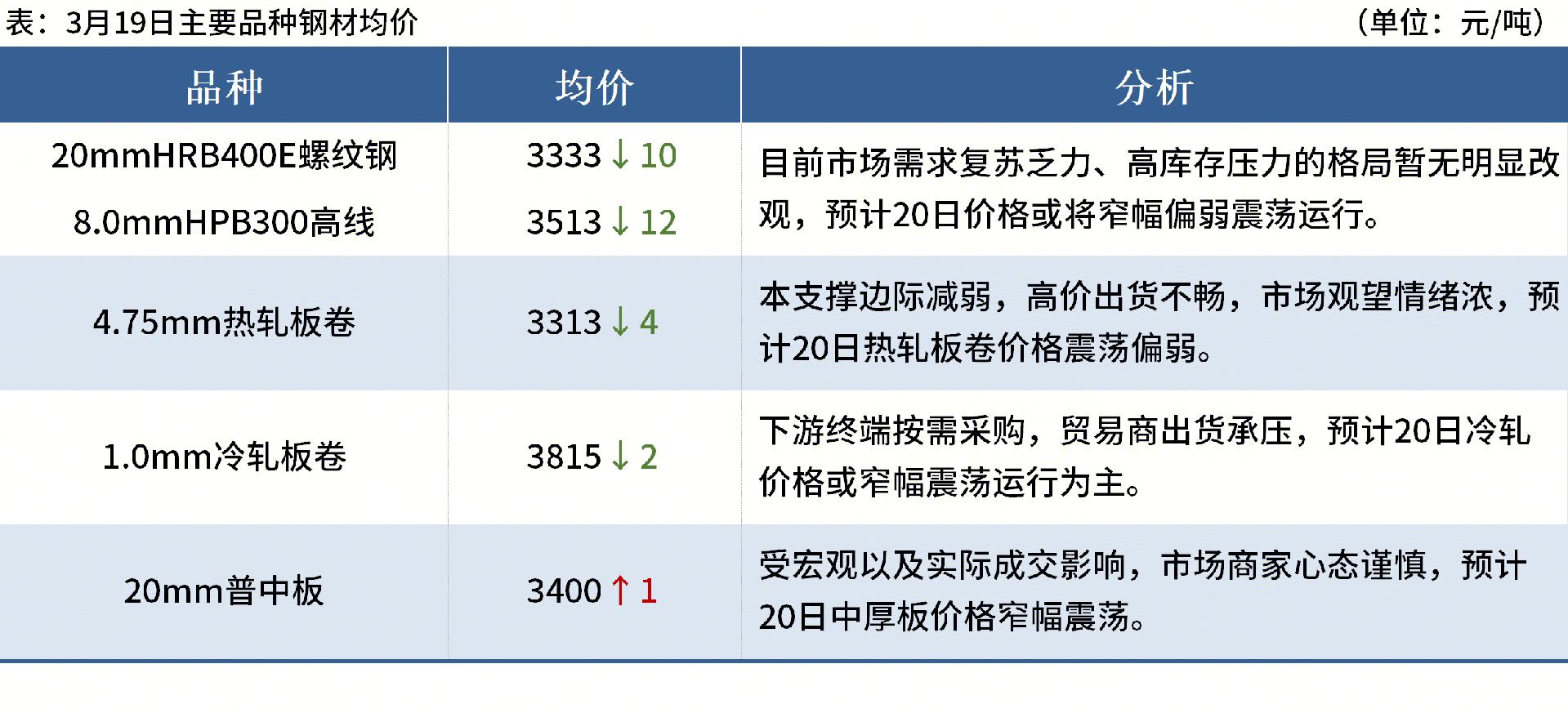 ◎3月19日,湖北建筑鋼材價(jià)格弱勢(shì)下行,螺紋鋼主流報(bào)價(jià)3080-3140元/噸,盤螺3310-3380元/噸。省內(nèi)多家鋼廠宣布自26日起上調(diào)螺紋鋼Φ16、Φ22規(guī)格加價(jià)20元/噸。